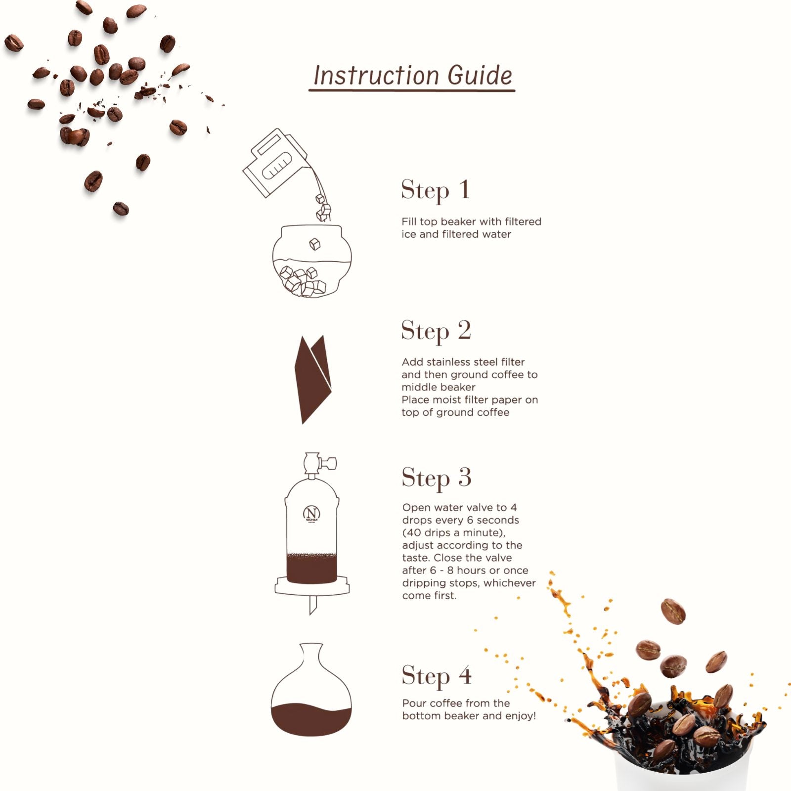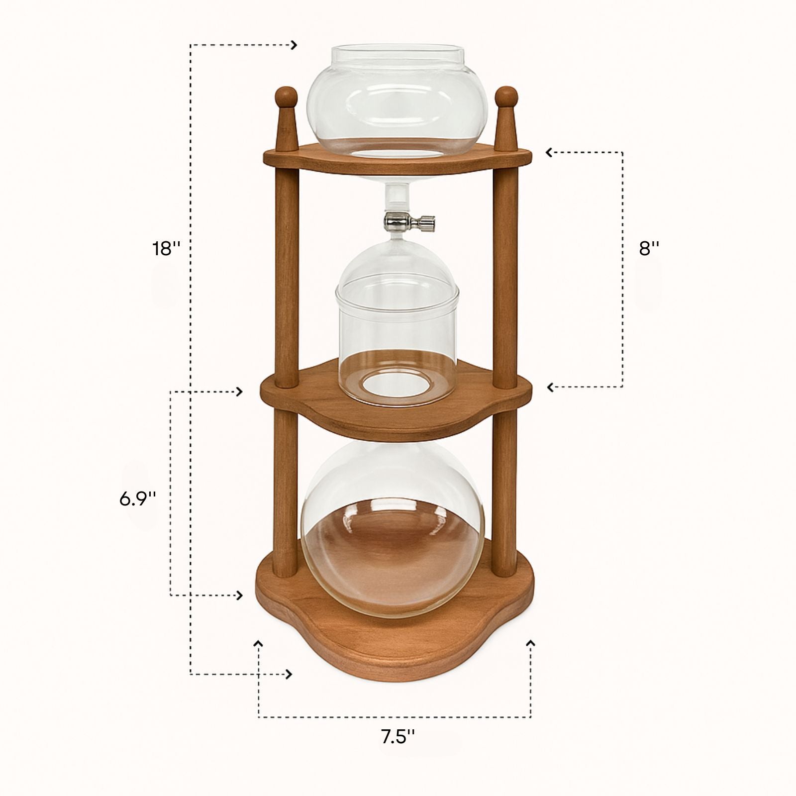 Vintage cold brew coffee maker set in brown color wooden frame. Makes rich coffee and looks great anywhere from your kitchen to your office. Eco-friendly using less plastic than other coffee competitors. Includes thick and sturdy glassware, filters and an adjustable valve to control the process time. The filter and the adjustable valve insure that no coffee grounds get into your final cup of coffee. Easy to assemble, and easy clean after each use. Brief instructions included. Cold brew gives an ultra smooth taste, slightly sweeter, less acidic and not as bitter as a hot cup of coffee. Makes around 6-8 cups of premium cold brew iced coffee. 19'' x 7.5'' x 7.5''