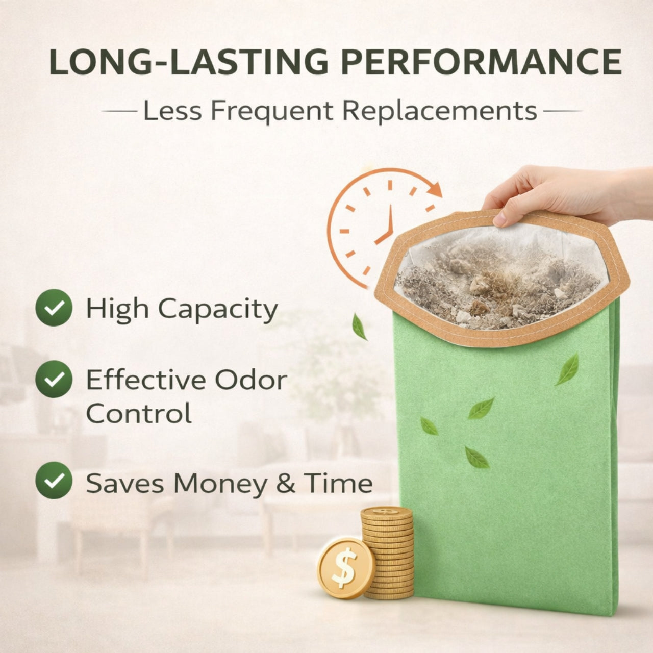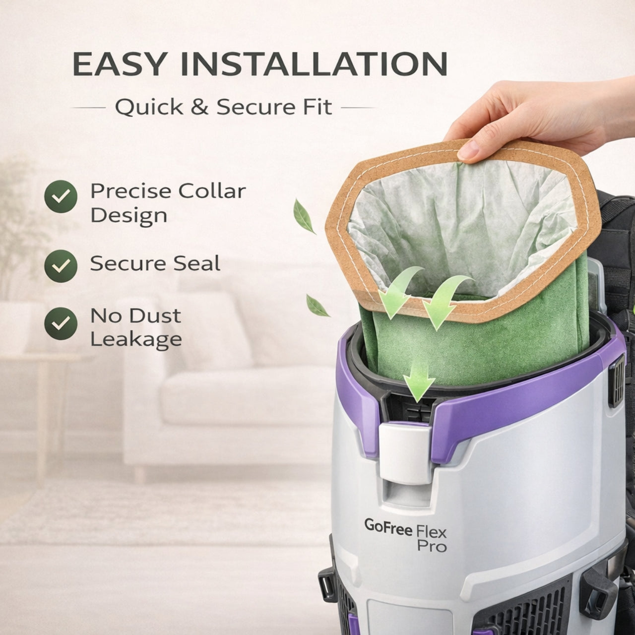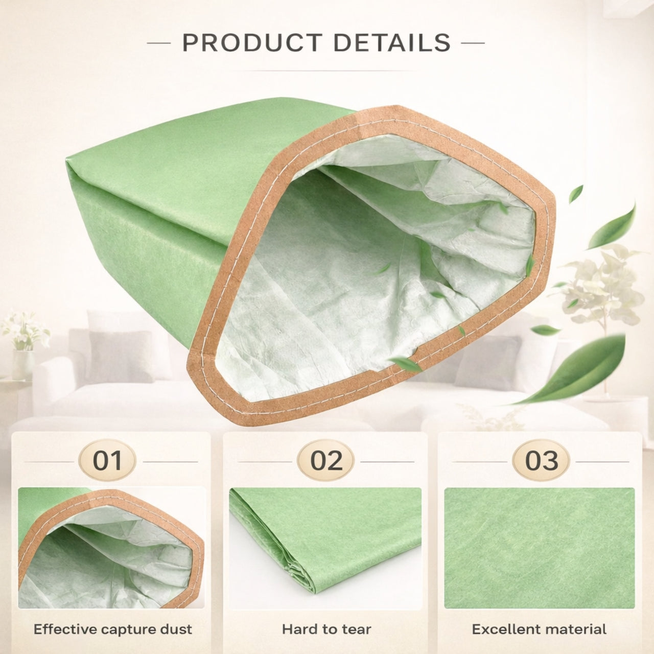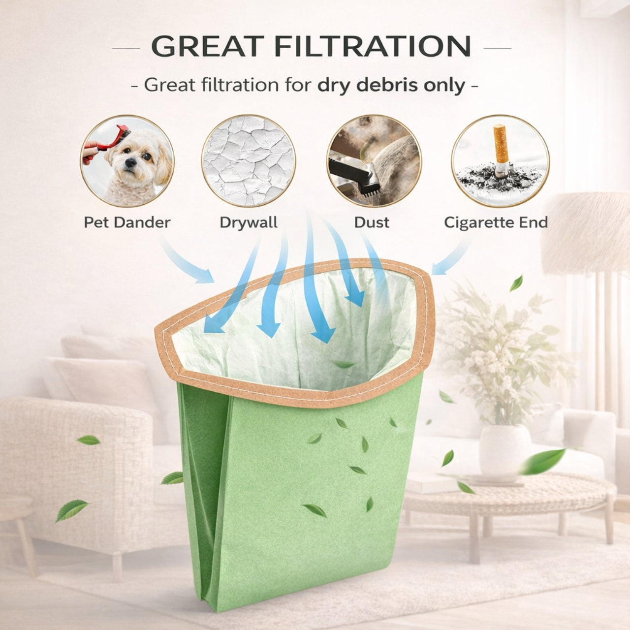 • • Durable Multi-Layer Filtration Material Constructed with high-quality nonwoven layers to capture fine dust, pet hair, drywall particles, and everyday debris.