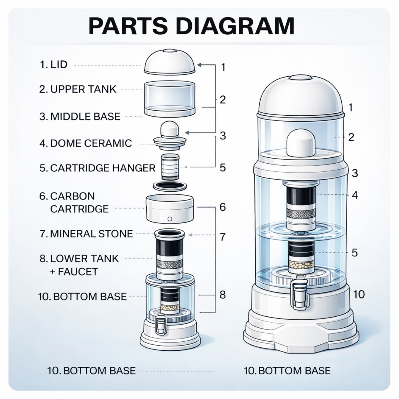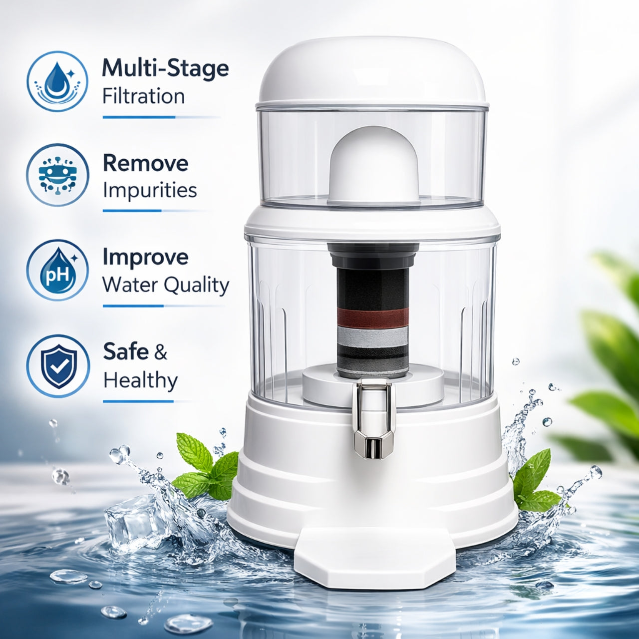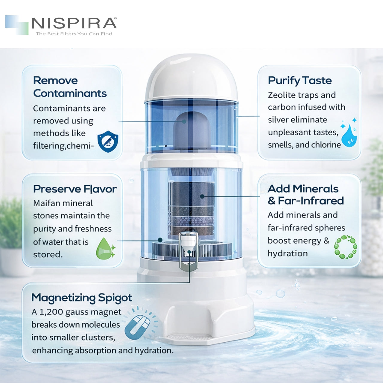 The Nispira 12L Mineral Water Purifier is designed to improve the quality and taste of everyday drinking water through a reliable multi-stage gravity filtration process. With a generous 12-liter (3 gallon) capacity, this countertop water purifier is ideal for households, offices, apartments, and shared spaces.