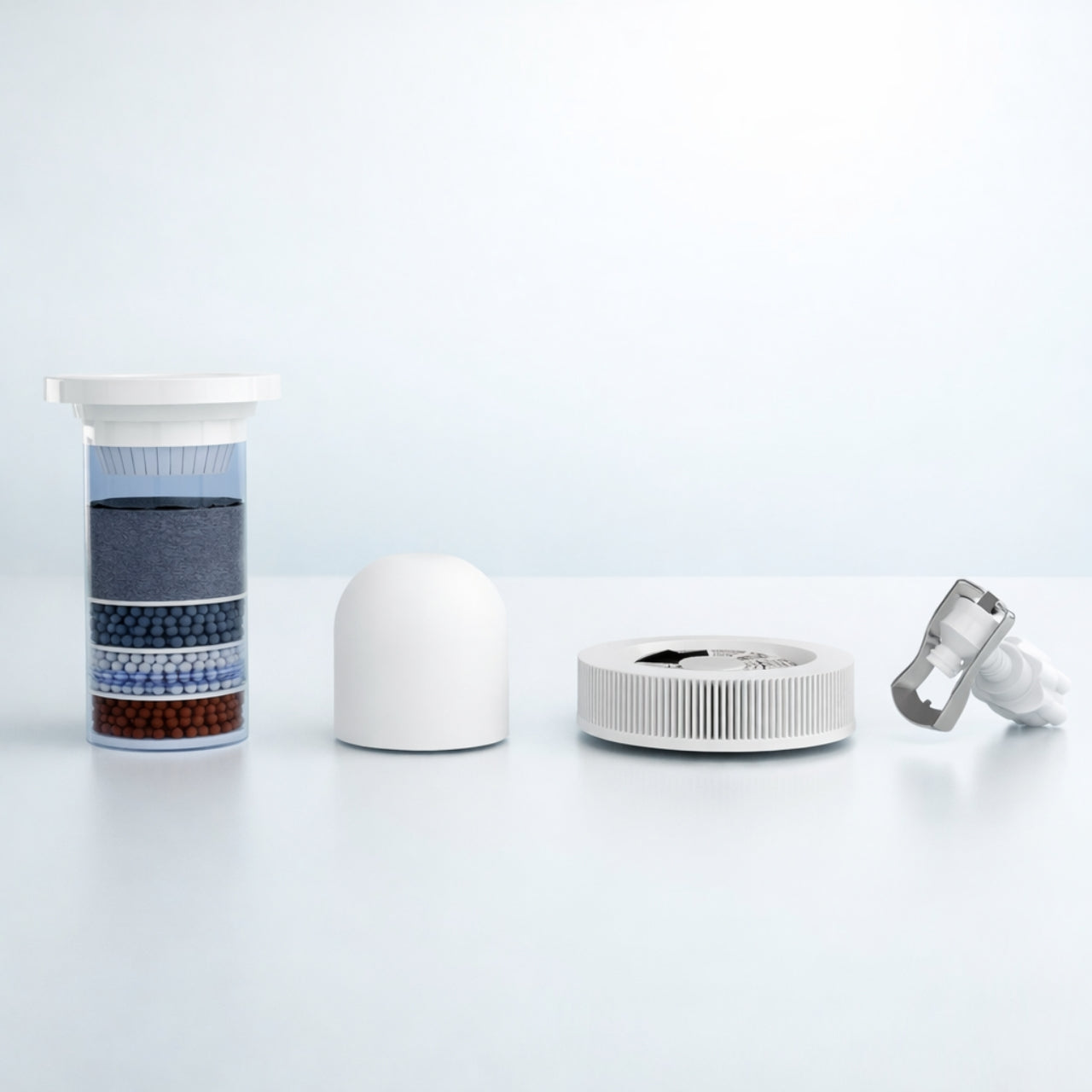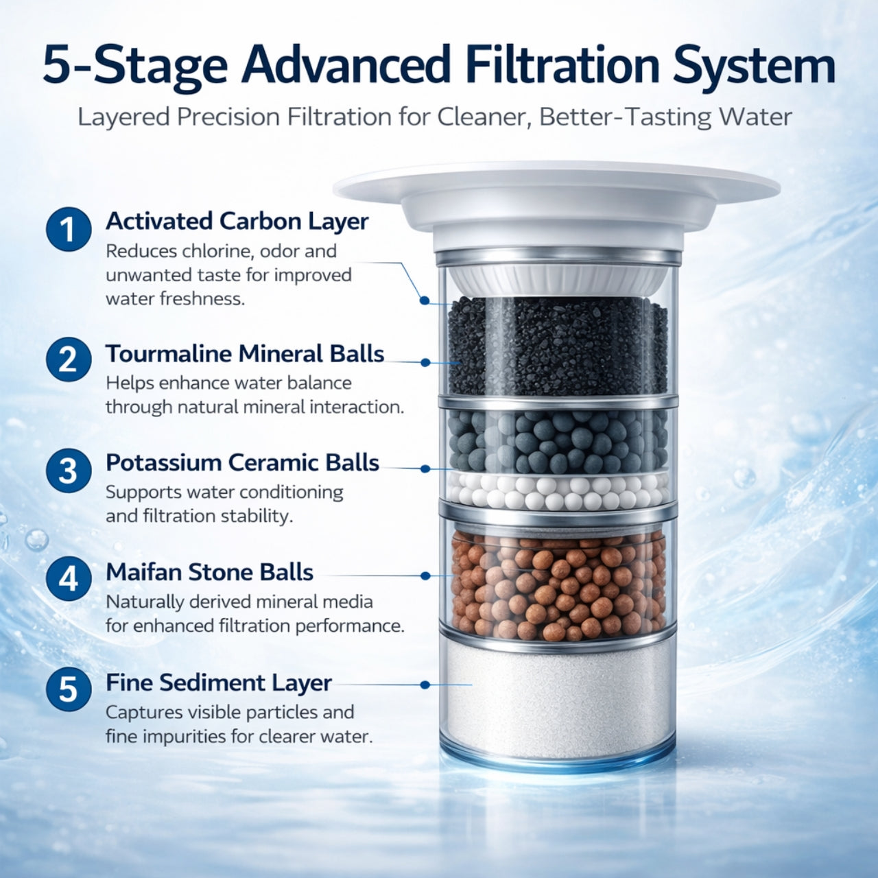 The filtration system features sediment and activated carbon layers that help reduce chlorine taste and odor, rust, sand, and other common visible impurities found in tap water. The integrated mineral support design helps maintain a balanced mineral profile, contributing to a clean and refreshing drinking experience.