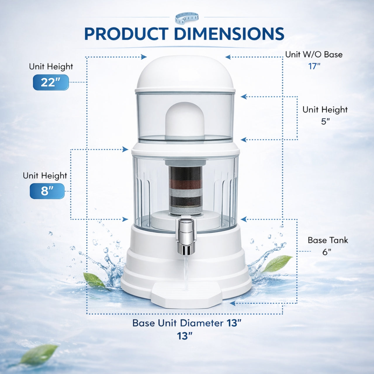 This gravity-fed water filter system operates without electricity, making it an economical and energy-efficient solution for daily hydration. Its tower-style design allows for convenient countertop placement and easy access to filtered water throughout the day.