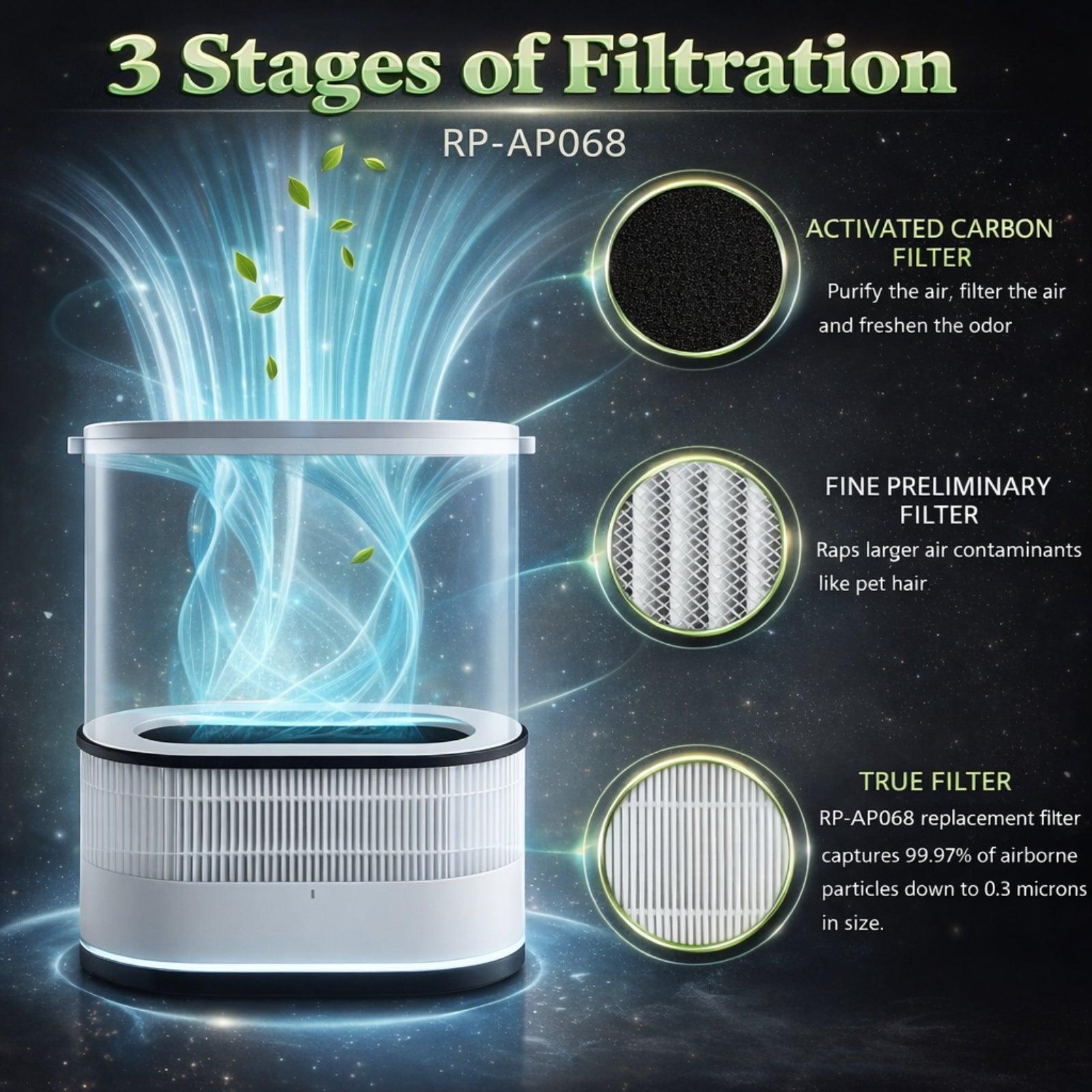 This 3-in-1 True HEPA replacement filter is designed to be compatible with the RP-AP068 air purifier and provides a practical solution for maintaining consistent filtration performance. Built with a multi-stage structure, it supports effective air circulation while helping reduce common airborne particles and household odors.