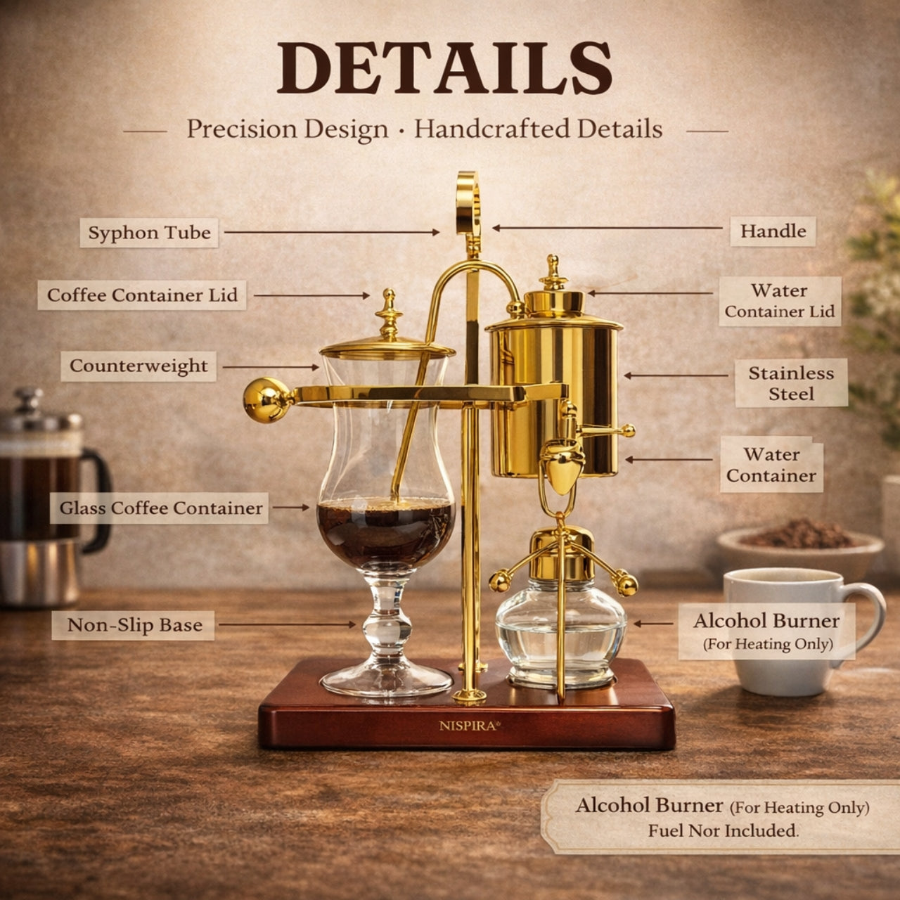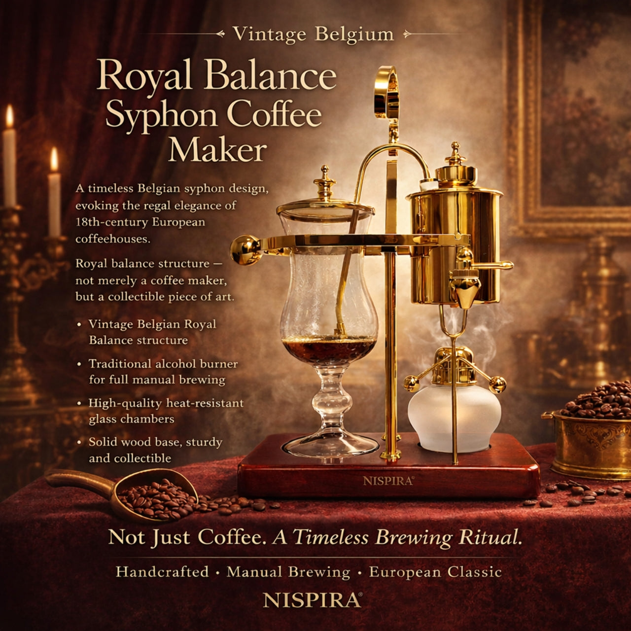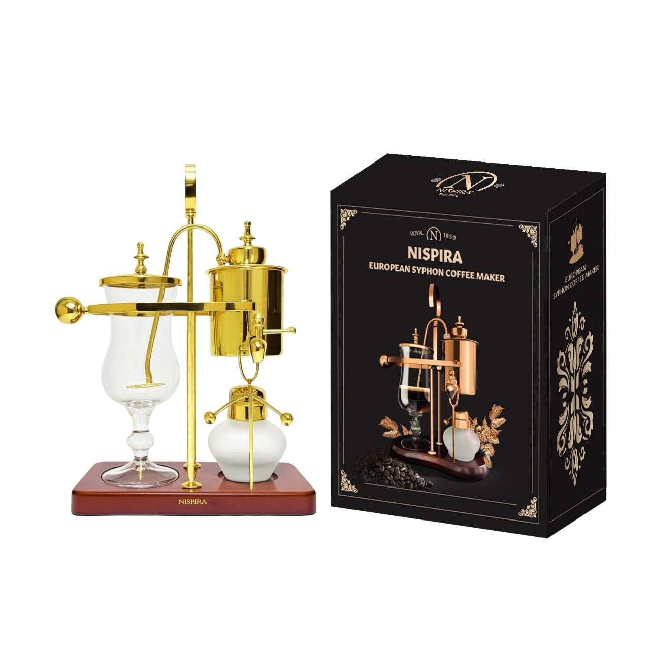 The Nispira Vintage Belgian Syphon Coffee Maker in gold finish is a tabletop vacuum brewer designed for coffee lovers who appreciate precision and ritual in brewing. Using classic Belgian balance siphon brewing technology, this brewer produces a smooth, aromatic cup that highlights the nuanced flavors of your favorite beans.