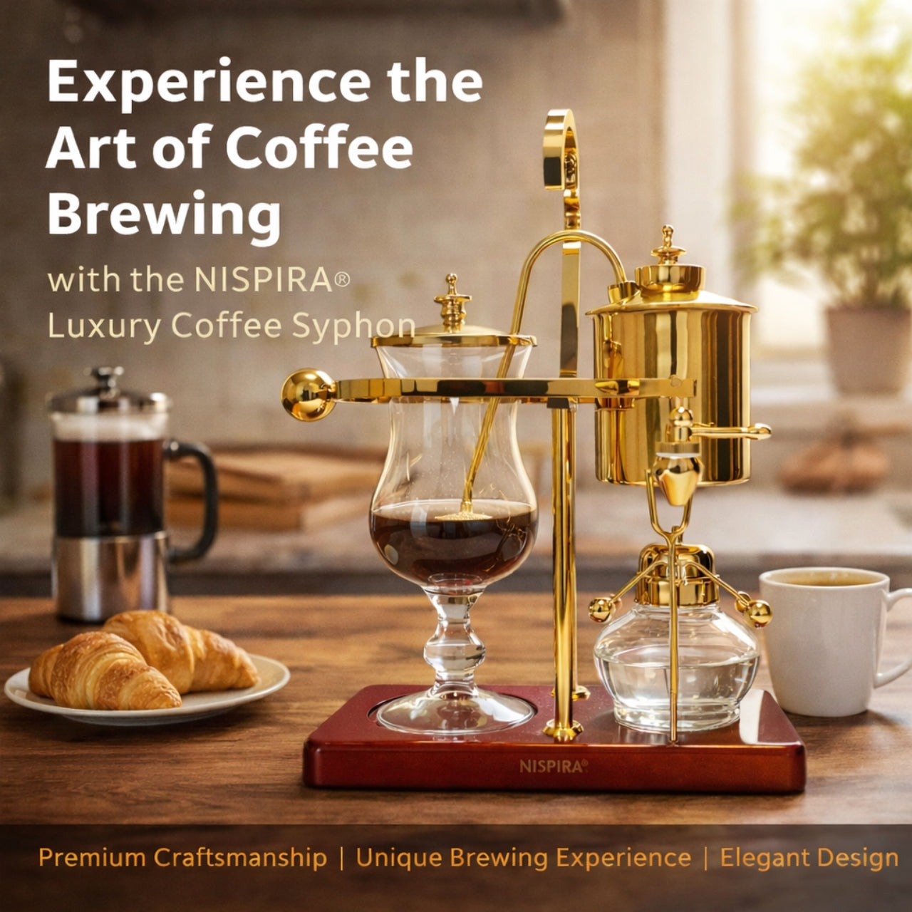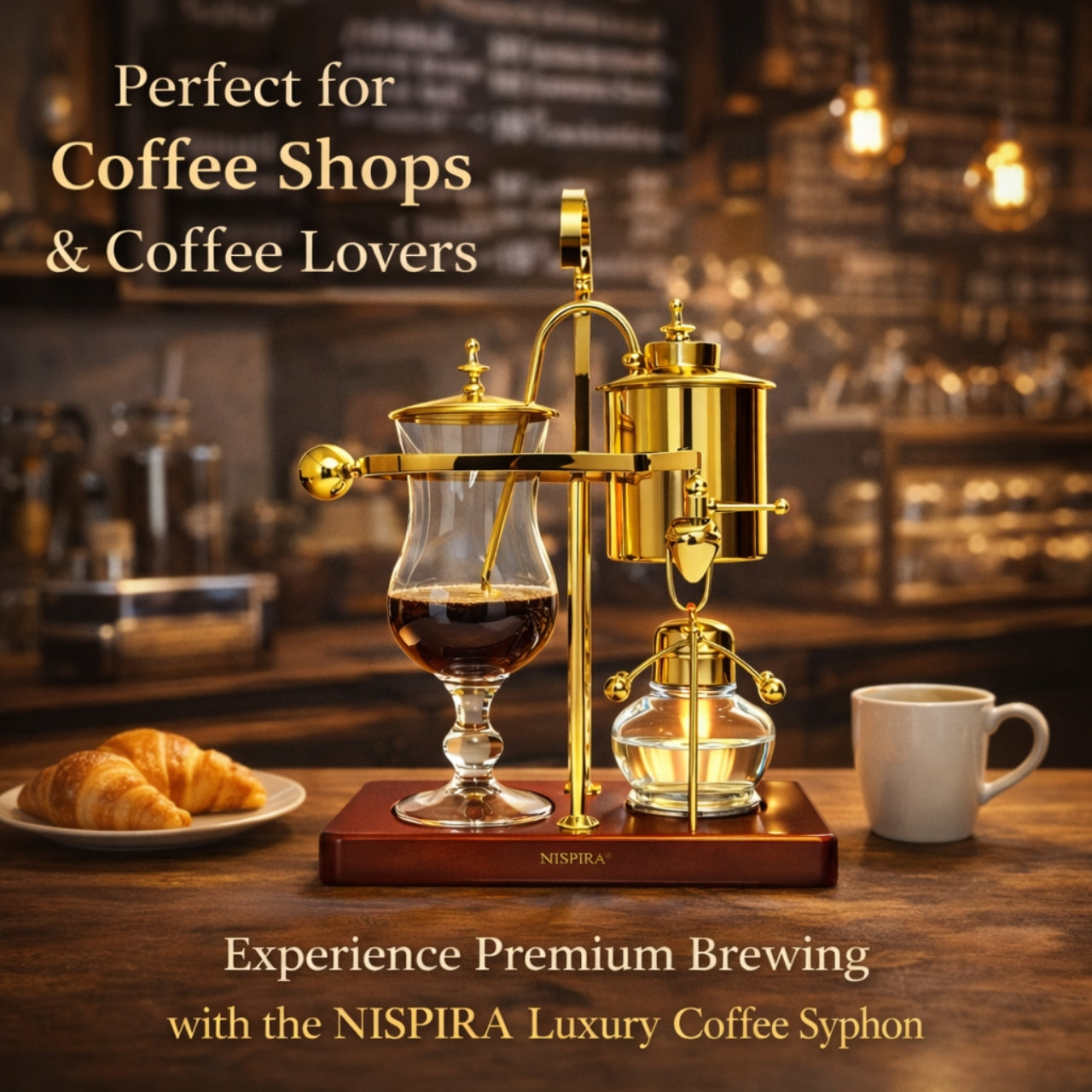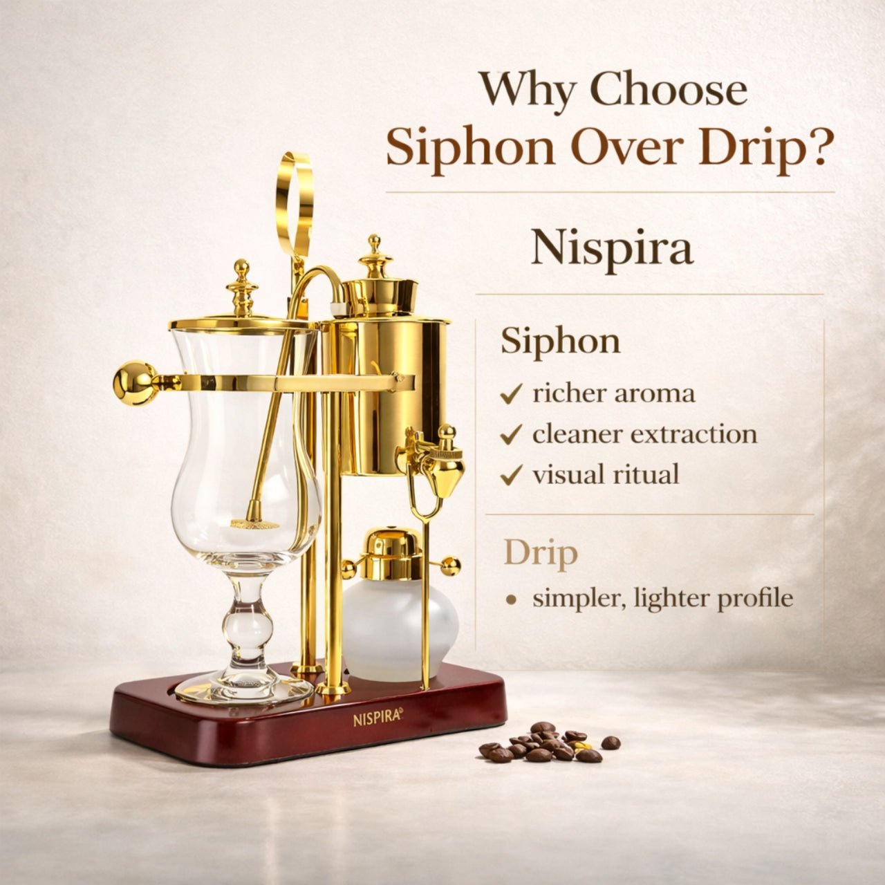 The Nispira Vintage Belgian Syphon Coffee Maker in gold finish is a tabletop vacuum brewer designed for coffee lovers who appreciate precision and ritual in brewing. Using classic Belgian balance siphon brewing technology, this brewer produces a smooth, aromatic cup that highlights the nuanced flavors of your favorite beans.