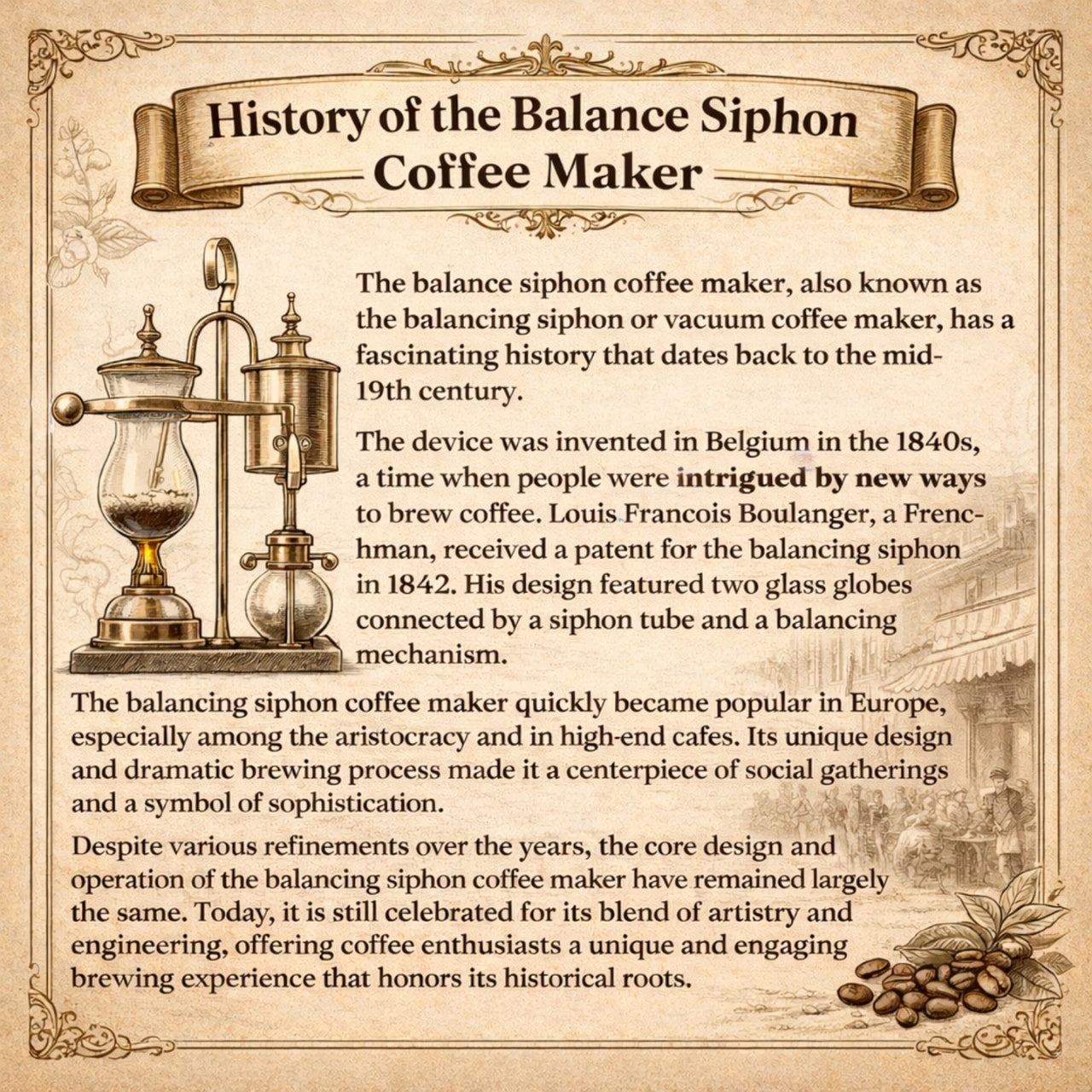 This balance syphon coffee maker uses heat and vacuum pressure to draw water through coffee grounds, producing a clean and richly flavored cup. When heat is applied to the lower chamber, vapor pressure forces water upward into the upper chamber where grounds steep. Once the heat source is removed, vacuum action pulls the brewed coffee back down, filtered and ready to serve.