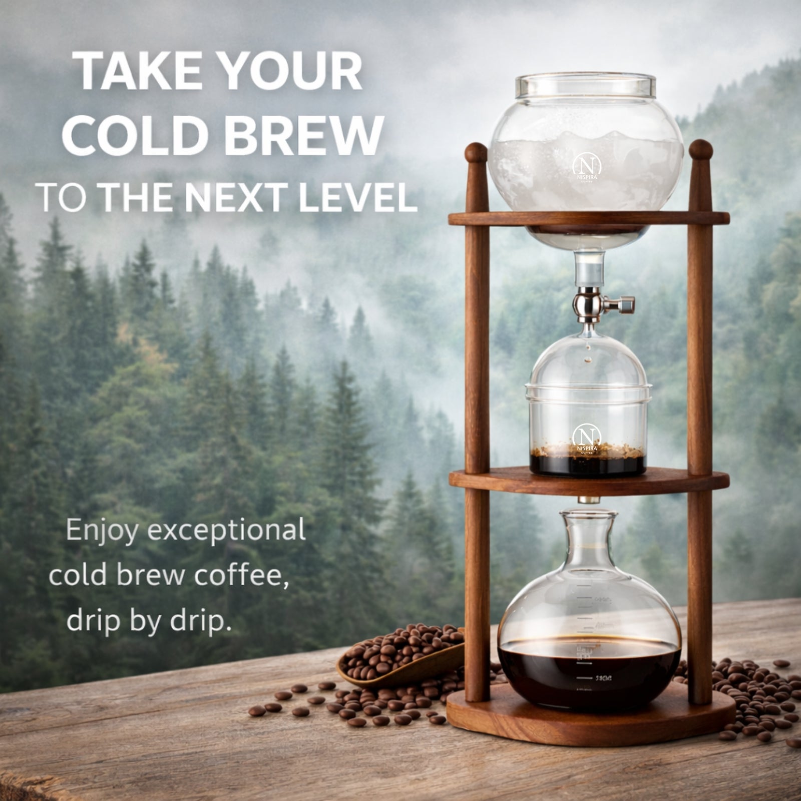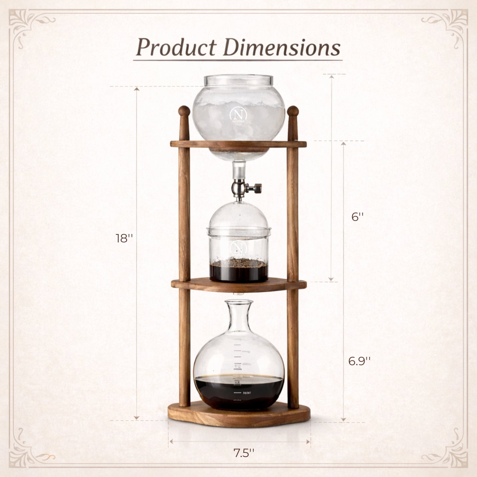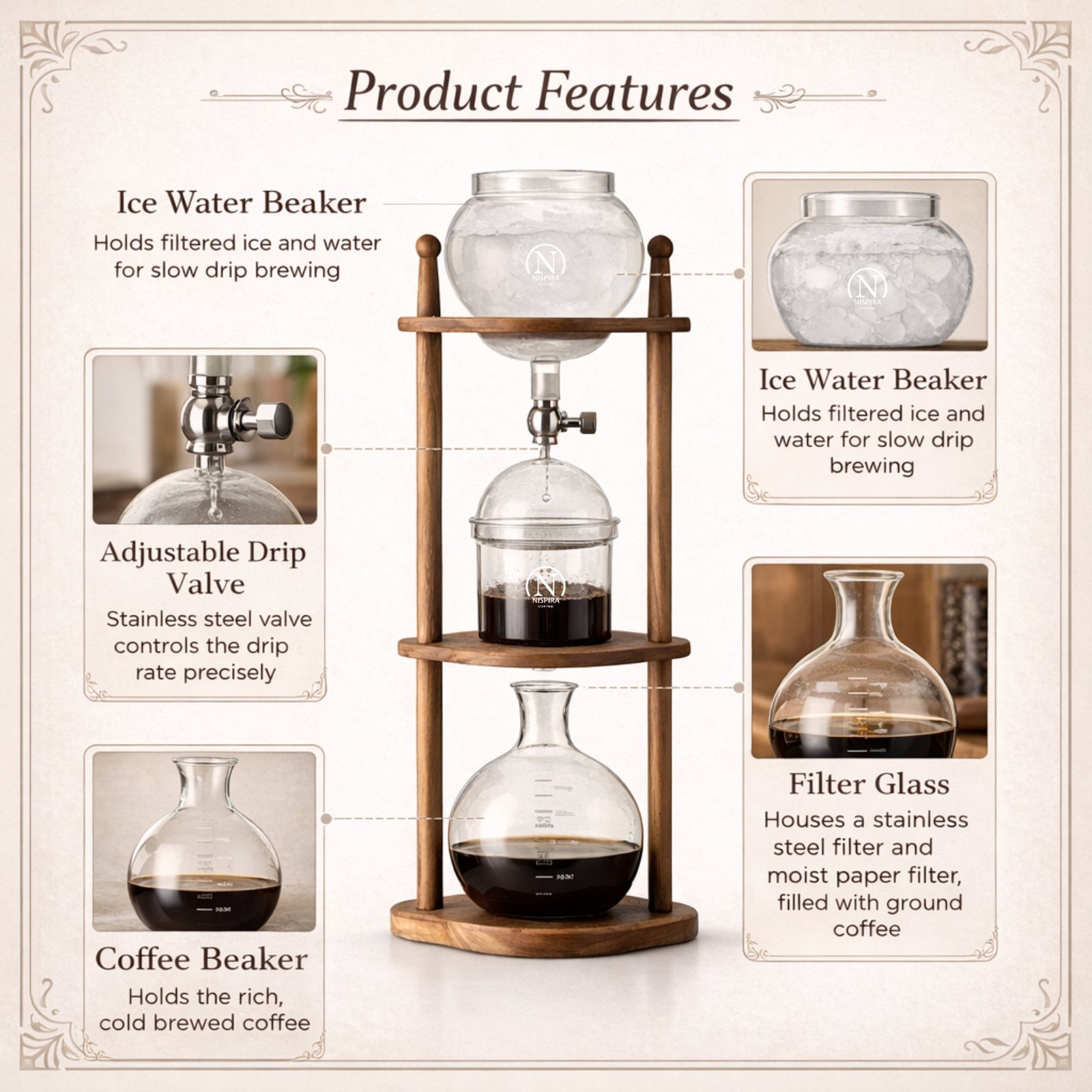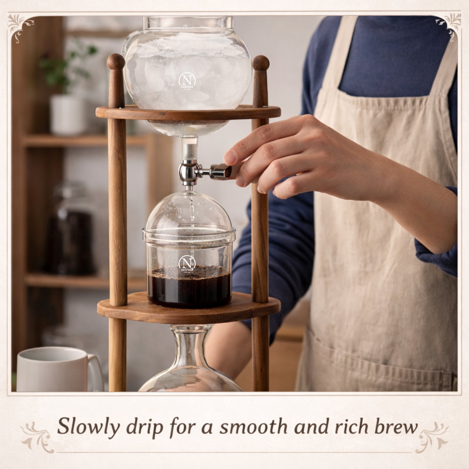 This vintage-style cold brew coffee maker features a warm brown wooden frame that brings both function and character to your kitchen, office, or coffee bar. Designed to brew rich, smooth cold brew coffee, it combines classic aesthetics with a refined slow drip brewing process that delivers consistent, high-quality results.